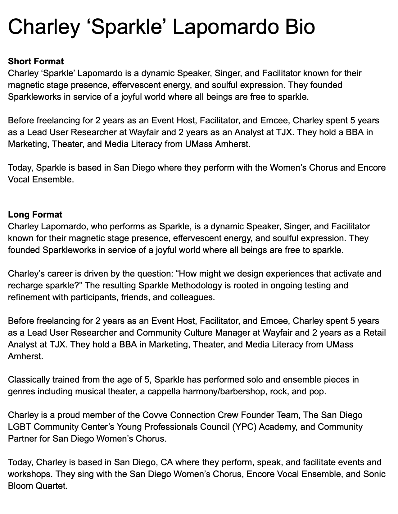 Charley Lapomardo, who performs as Sparkle, is a dynamic Speaker and Vocalist known for their magnetic stage presence, effervescent energy, and soulful expression.