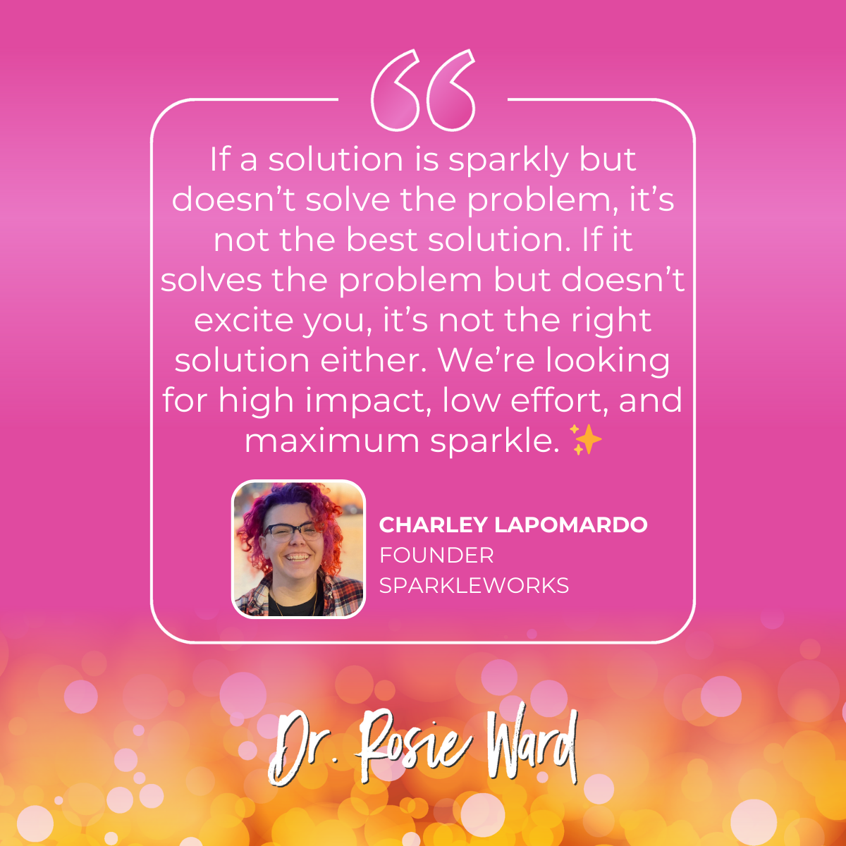 In this uplifting and energizing episode, Rosie connects with Charley Lapomardo, founder of Sparkleworks, to explore the power of embracing your inner sparkle and how it can transform problem-solving.